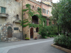 You find yourself walking across an immense Italian piazza bounded on the left by the back side of the Hotel MiraCosta, which is built to look like colorful multi-story townhouses. The effect, when looking that direction, is completely convincing. You could truly believe you were in an Italian port city (that just happens to be full of Japanese tourists).